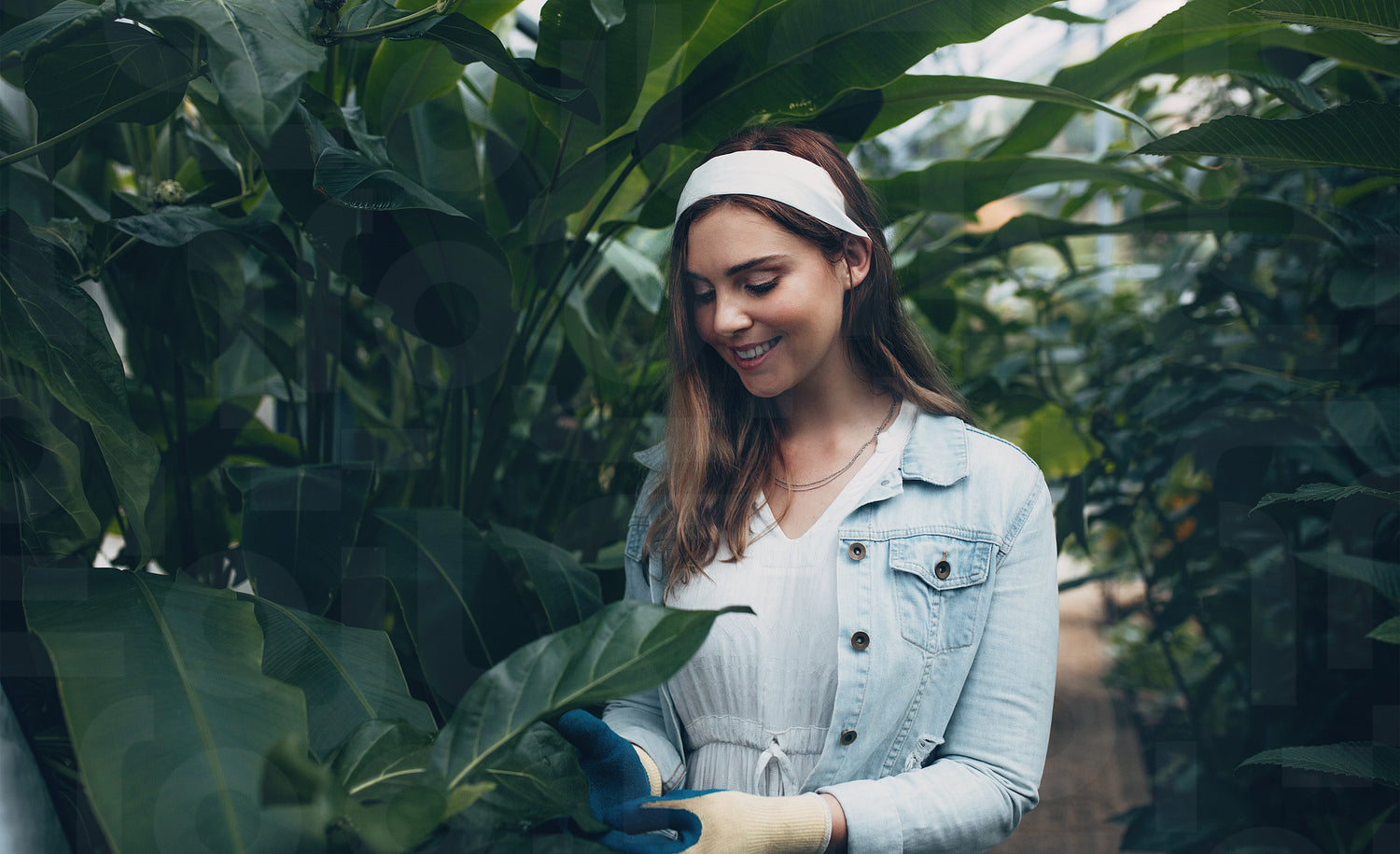 Beautiful young woman working in greenhouse. Happy female gardener taking care of plants.