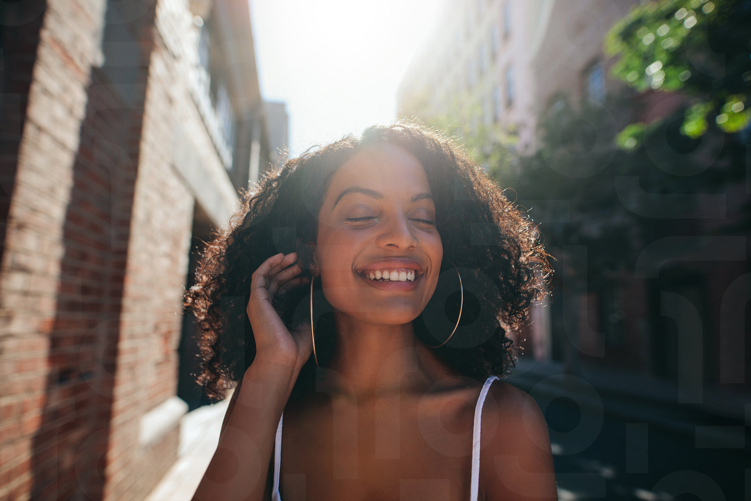 Close up portrait of beautiful young african woman walking outdoors in city with her eyes closed. Afro american female walking outdoors and smiling.