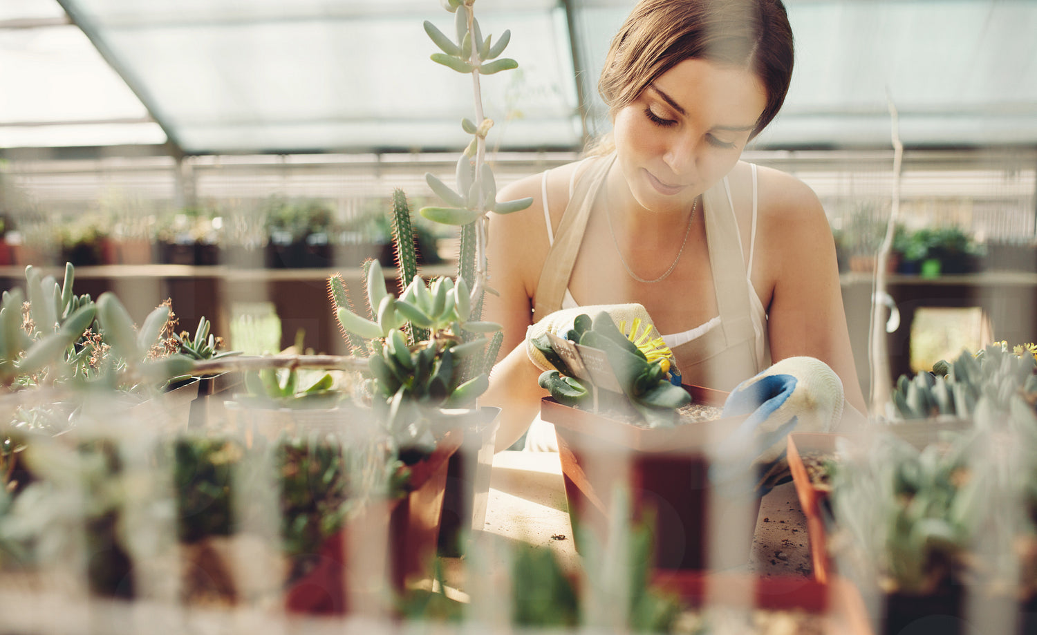 Beautiful young lady in plant nursery working on cactus plants. Female gardener at work in greenhouse.