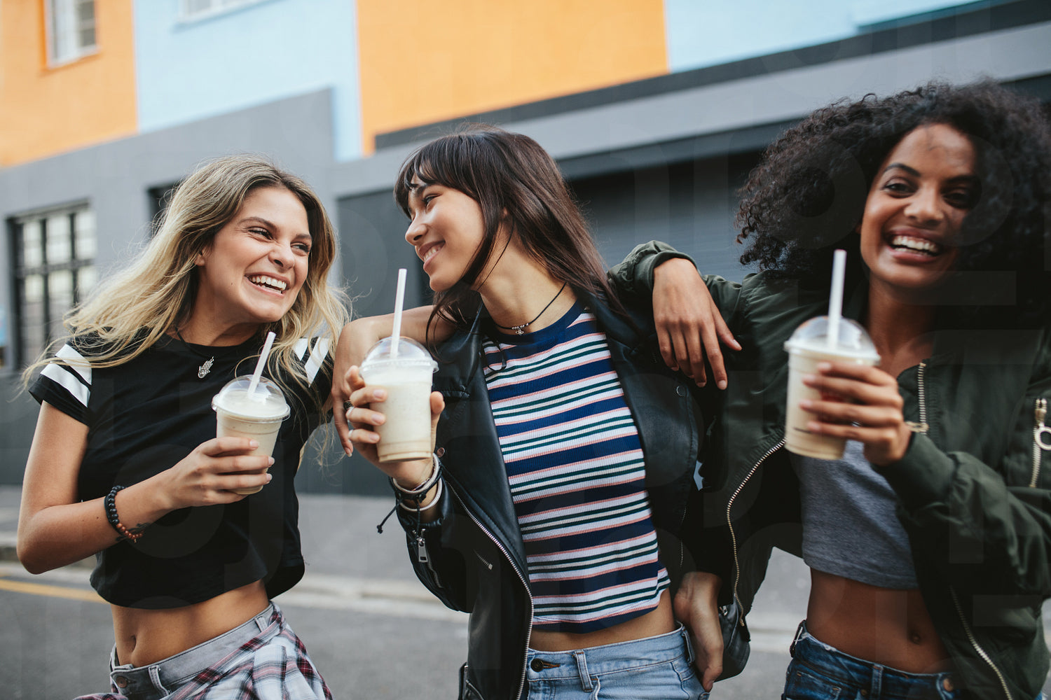 Outdoors shot of young women with ice coffee on city street. Multiracial group of female friends having ice coffee.