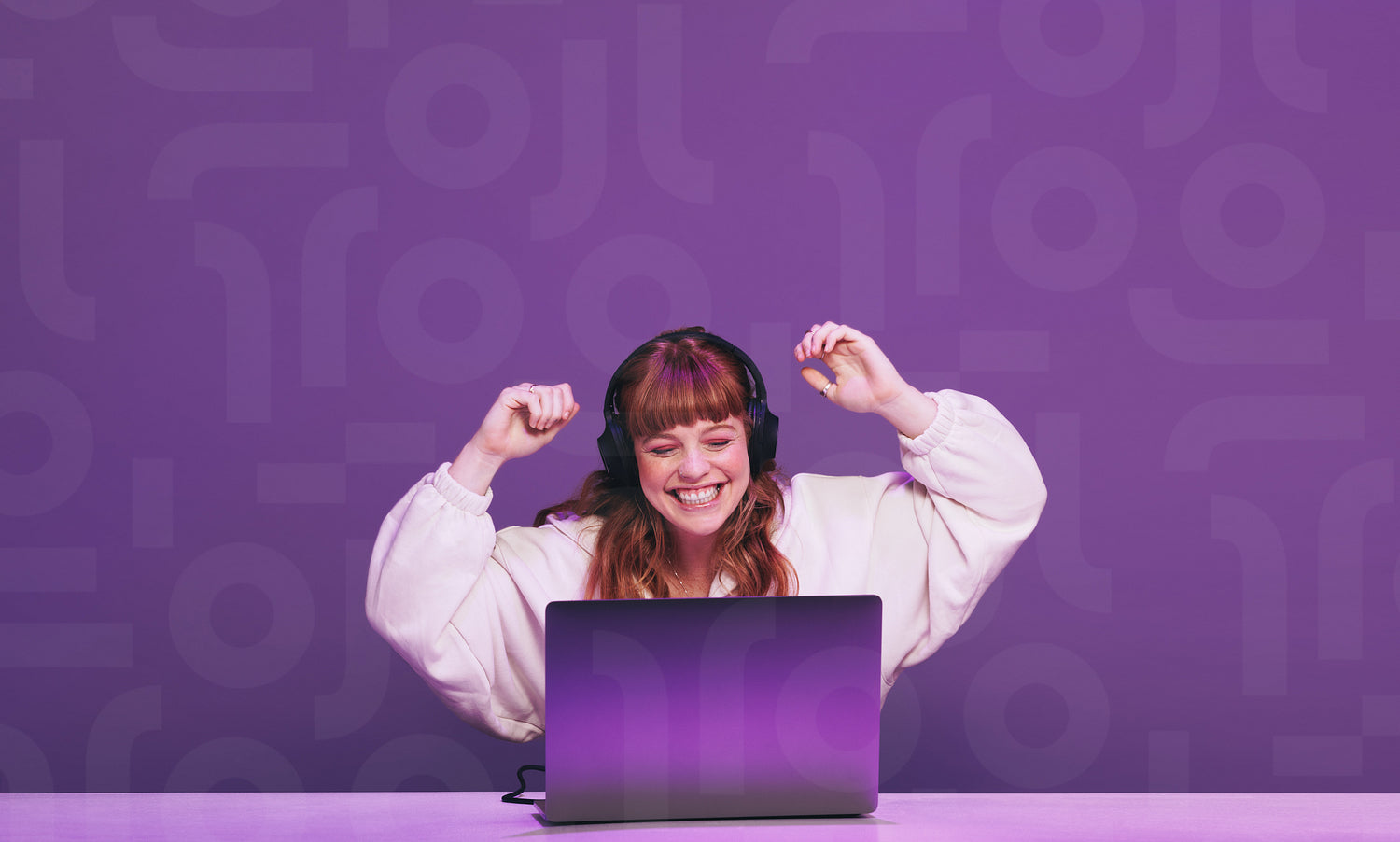 Female gamer celebrating after winning an online video game in a studio. Happy young woman using an interactive streaming service on her laptop.