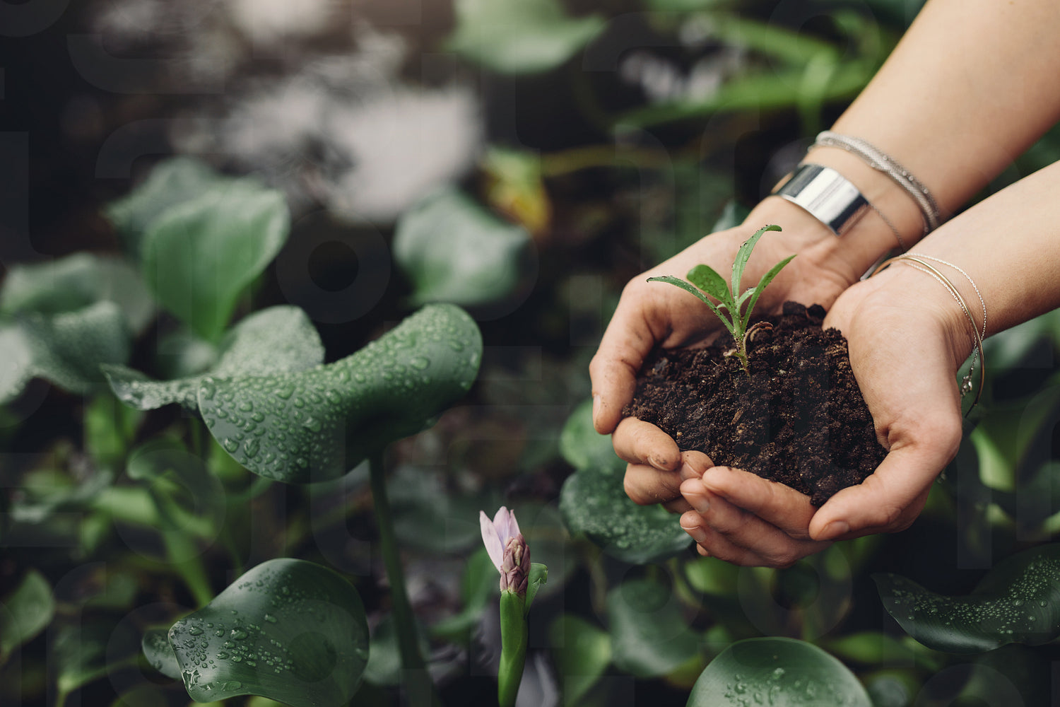 Close up image of female gardener hands holding a sapling at greenhouse. Woman planting new plant in the garden center.