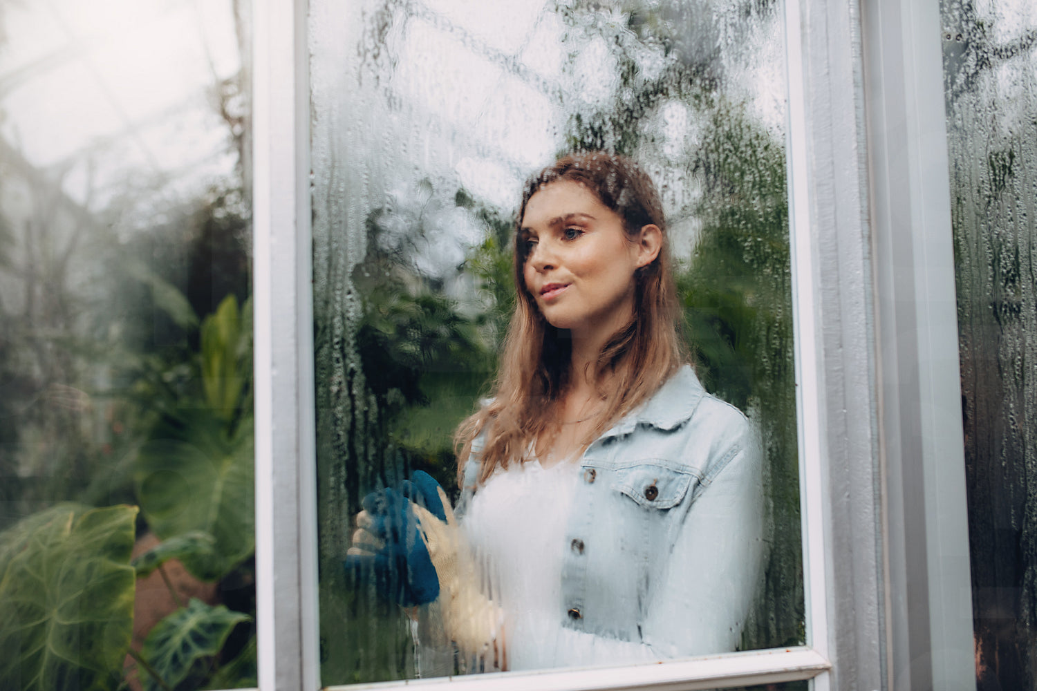Caucasian female standing inside greenhouse. Woman gardener in plant nursery.