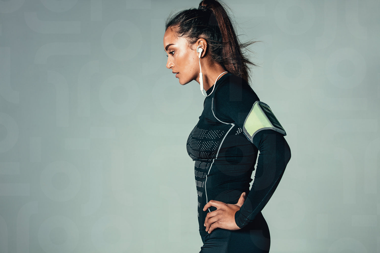 Side view of young woman listening to music with earphones. Fit female model standing with her hands on hips against grey background.