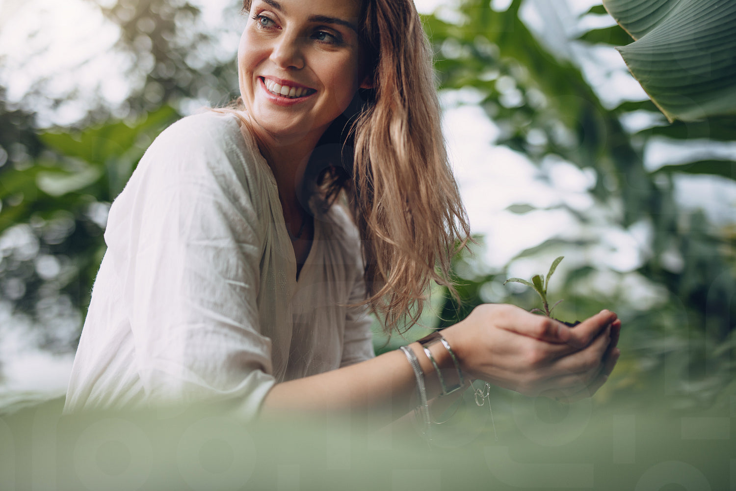 Caucasian woman holding small plant and smiling in the garden. Female gardener working in greenhouse holding a sapling.