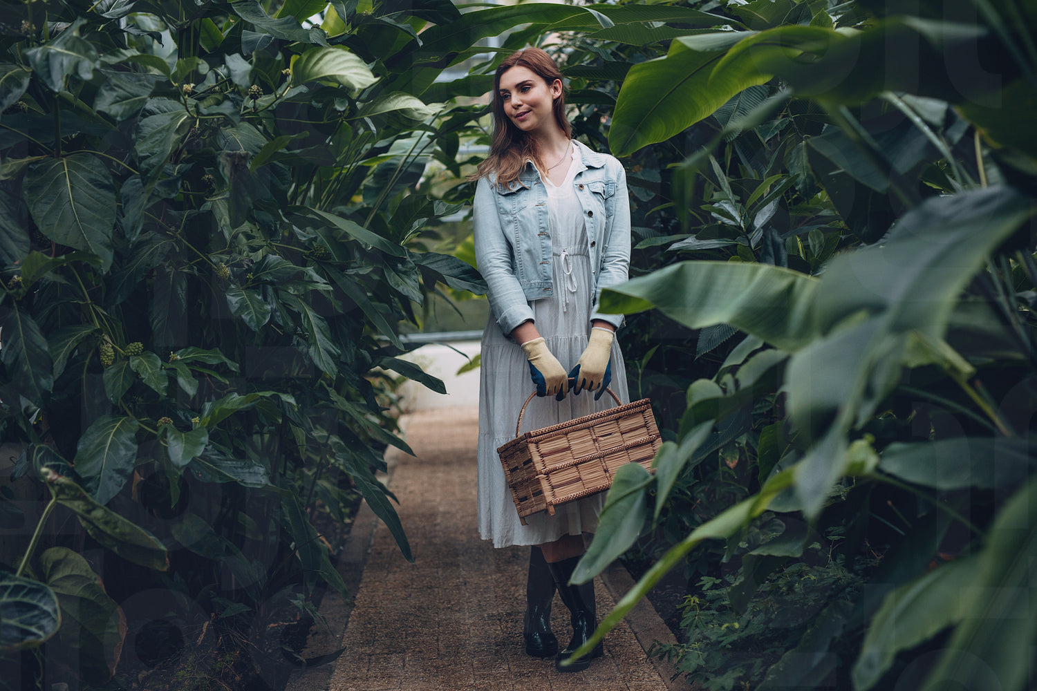 Beautiful woman in greenhouse standing with basket. Caucasian female holding basket at plant nursery.