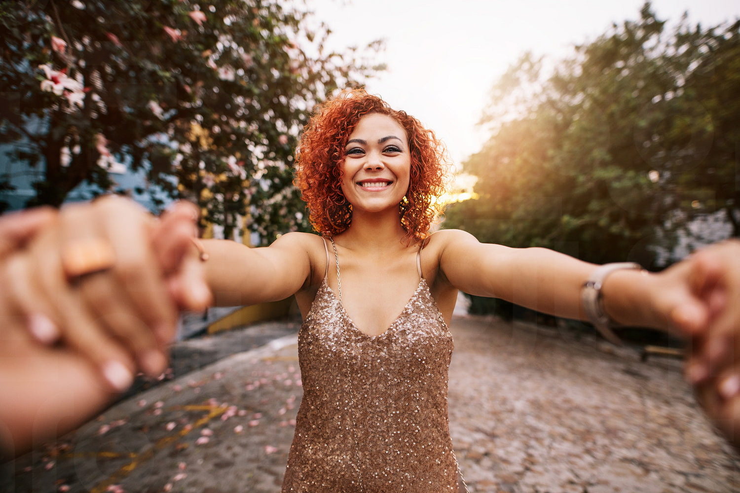 Woman in golden brown curly hair and a glamorous dress in a playful mood holding the hands of her partner. Smiling woman standing on a lonely street at sunset holding her partner hands.