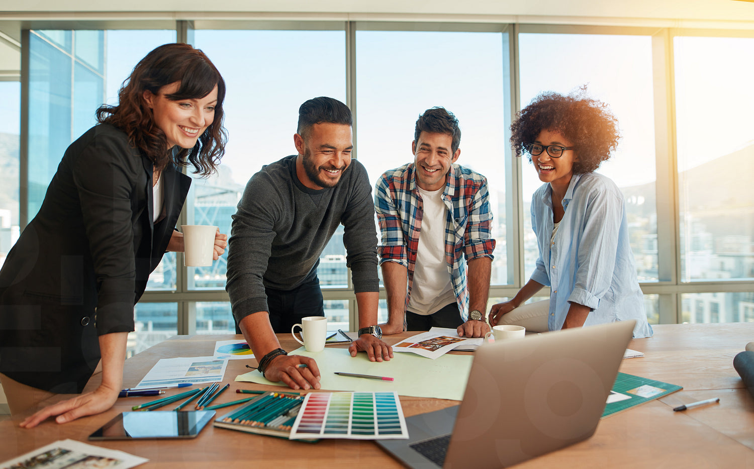 Young man discussing new designs and color scheme with colleagues in a meeting. Team of young professionals having a meeting in conference room looking at laptop.