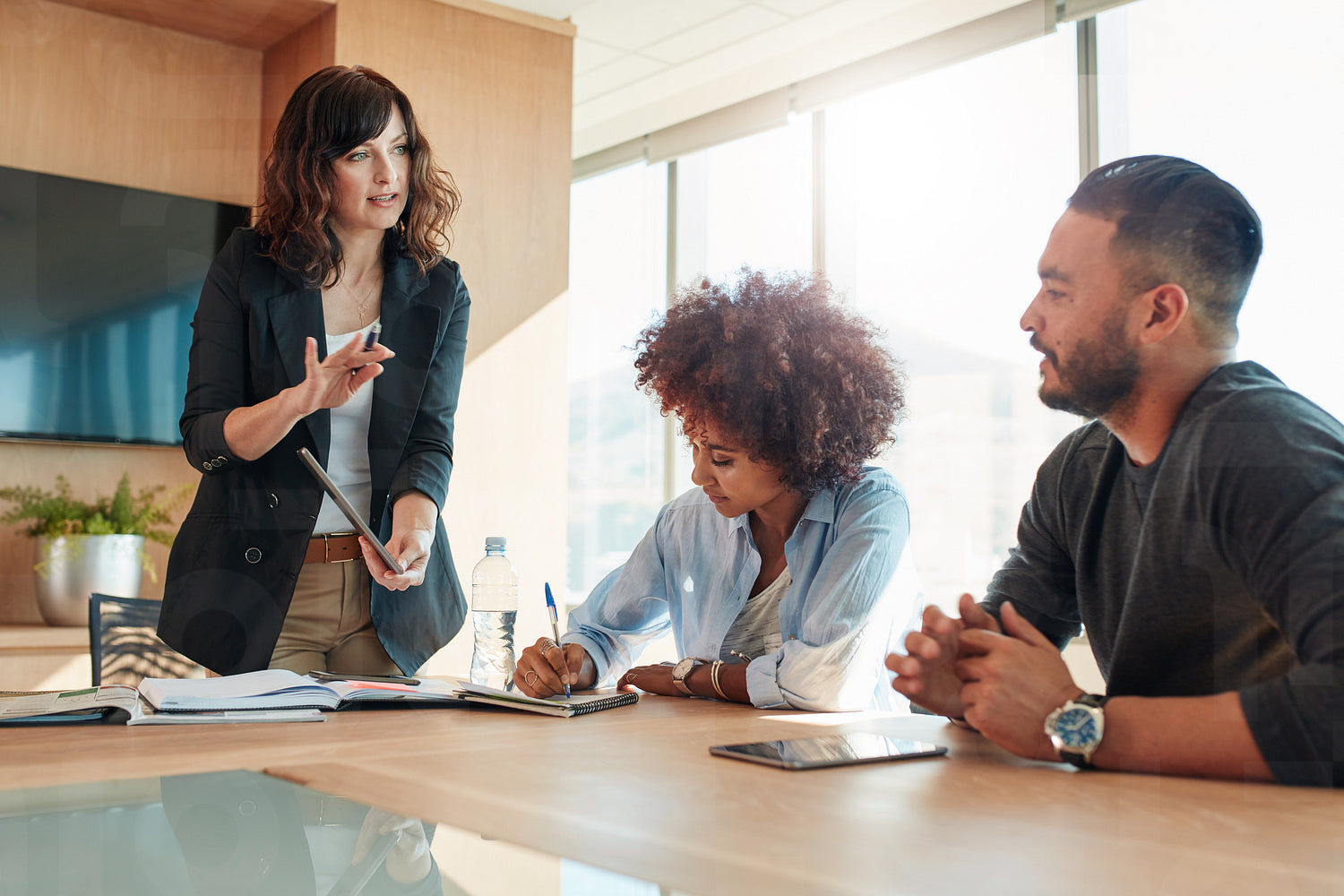 Young businesswoman showing something to her colleagues during a meeting in conference room. Multi ethnic business team discussing project in office.