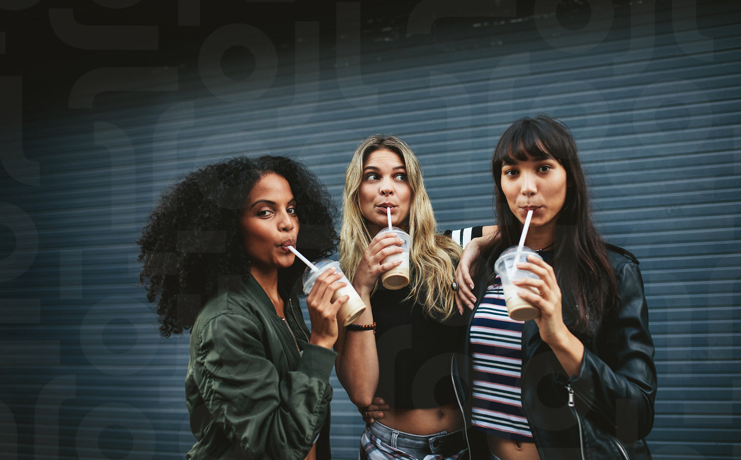 Beautiful young females having ice coffee outdoors. Multiracial group of women friends drinking coffee.