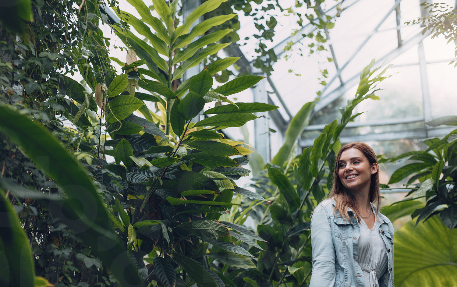 Woman standing in greenhouse near the plants. Smiling female looking at plants in nursery.