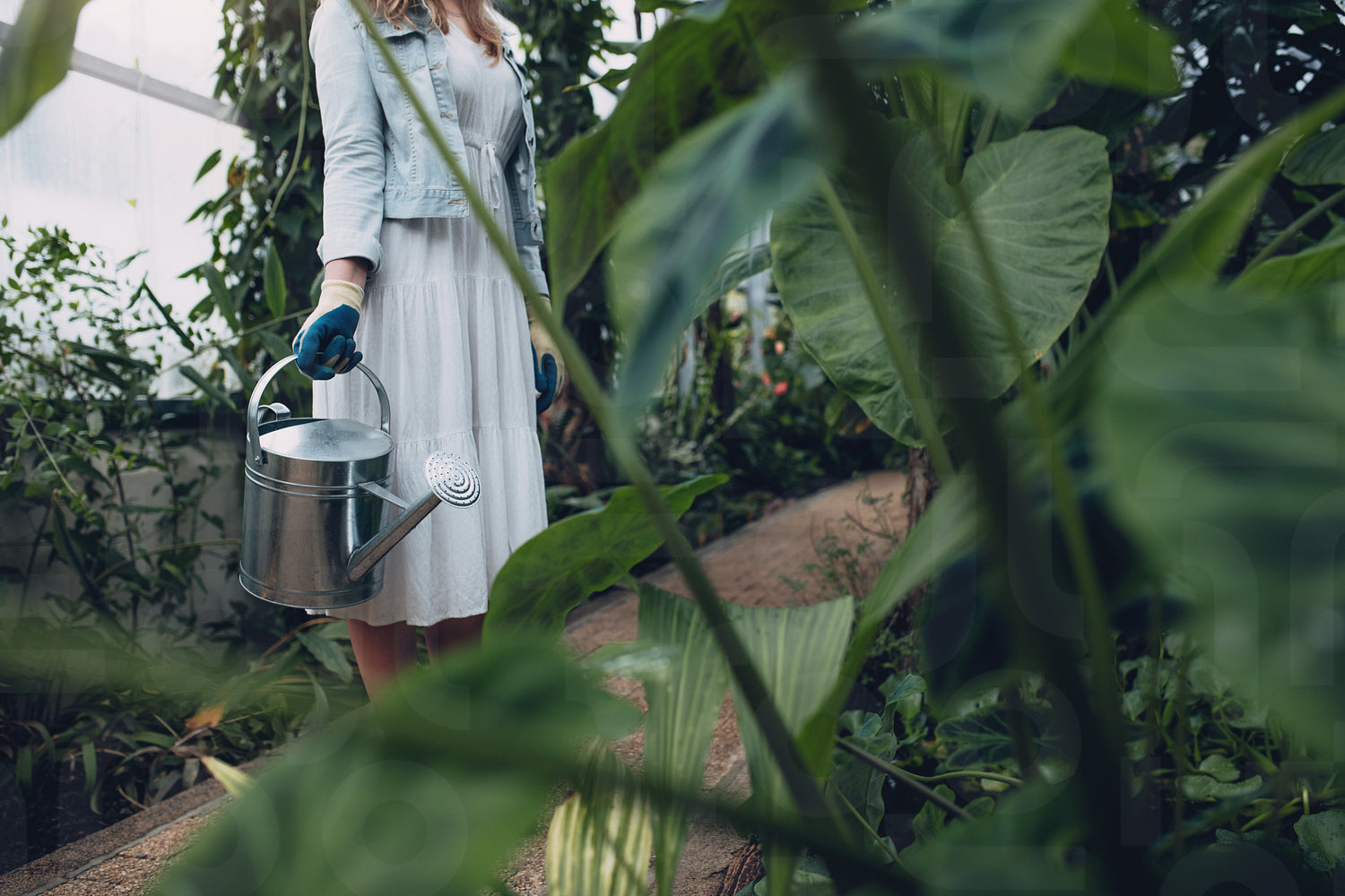 Cropped shot of a woman standing with watering can greenhouse. Female gardener working at plant nursery.