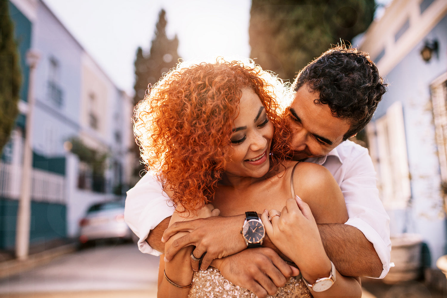 Man in happy mood holding woman in arms from behind while the woman holds his hands. Smiling woman enjoying the company of her partner.
