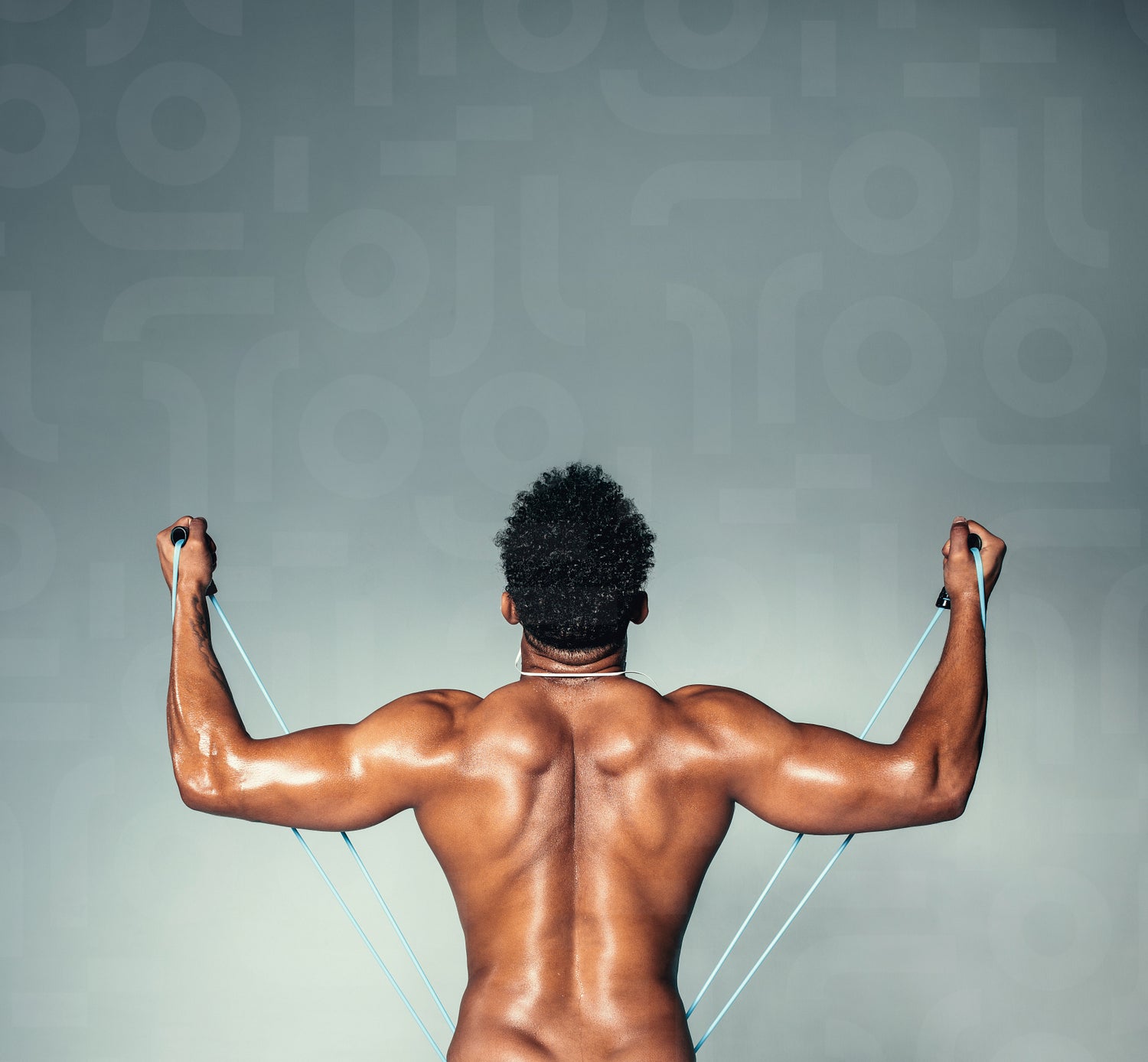 Rear view square shot of fitness male model using stretch band. Young man exercising with elastic band on grey background.