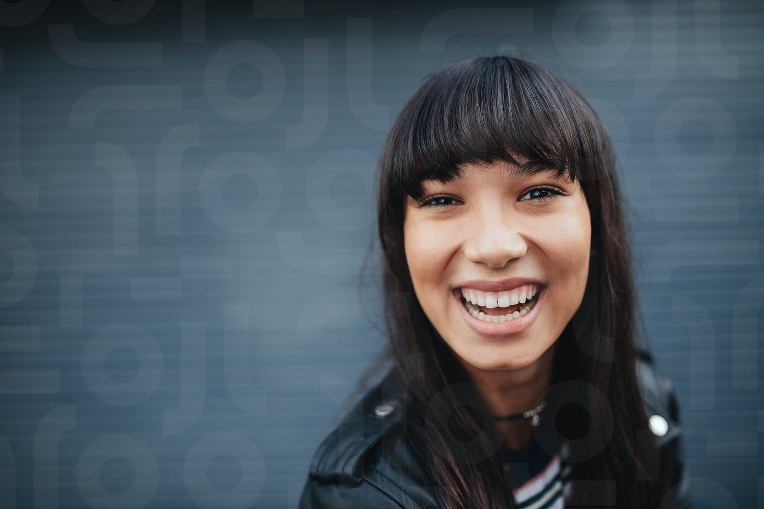 Close up portrait of young woman laughing against gray background. Beautiful hispanic female model having fun outdoors.