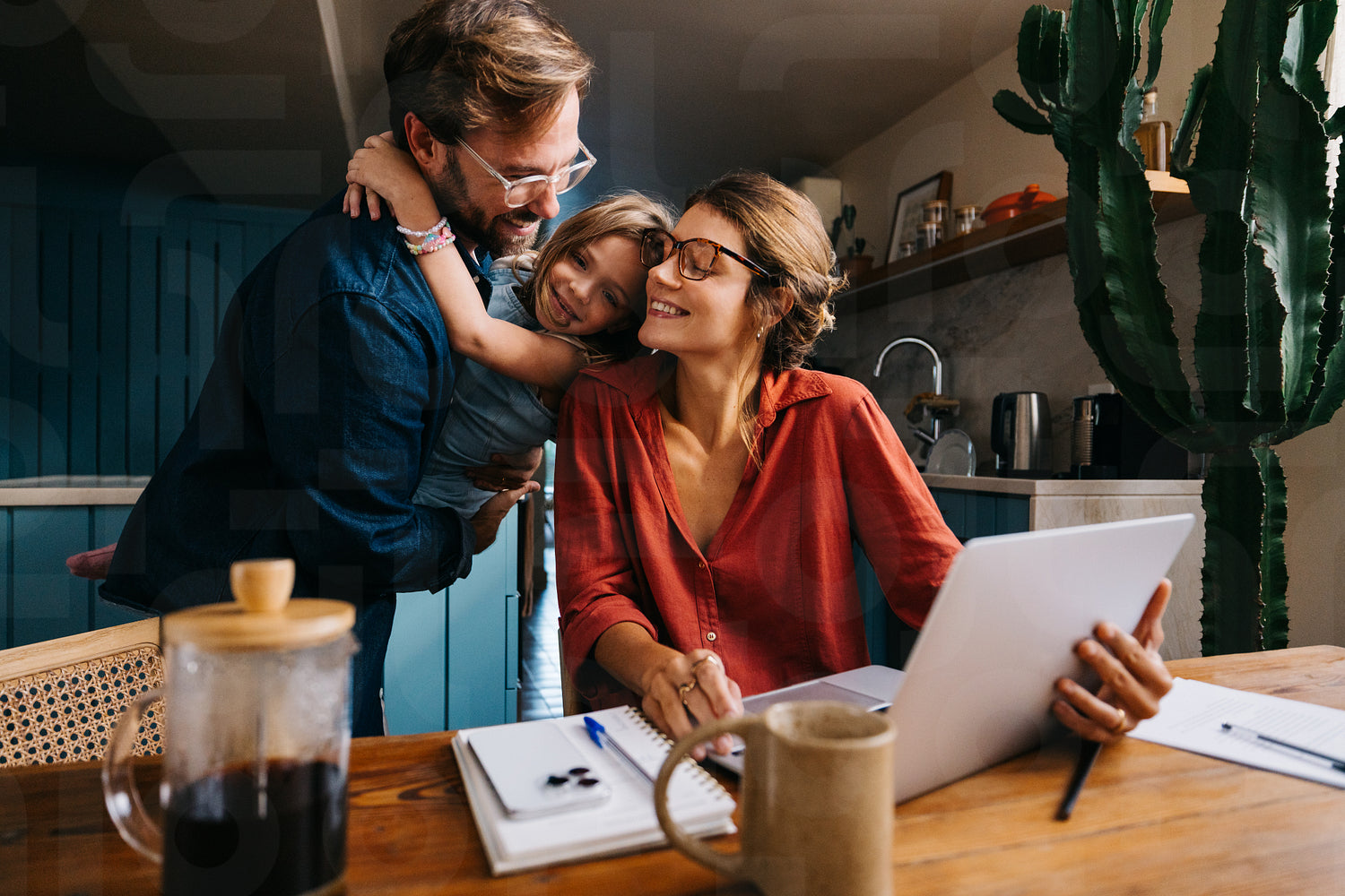 A mom connects with her daughter while working on a laptop in the kitchen, as the dad lifts the child close. Warm moment of family love, remote work, and everyday home life.