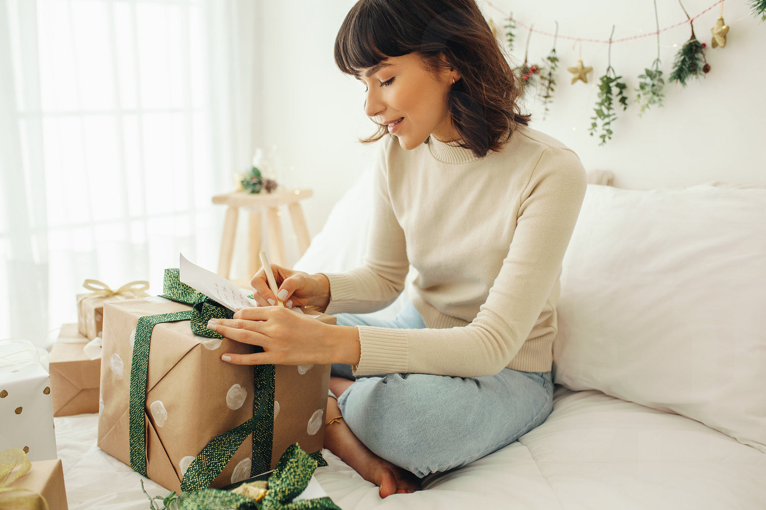 Woman sitting on bed and writing a letter for christmas. Woman celebrating christmas at home sitting with christmas presents.