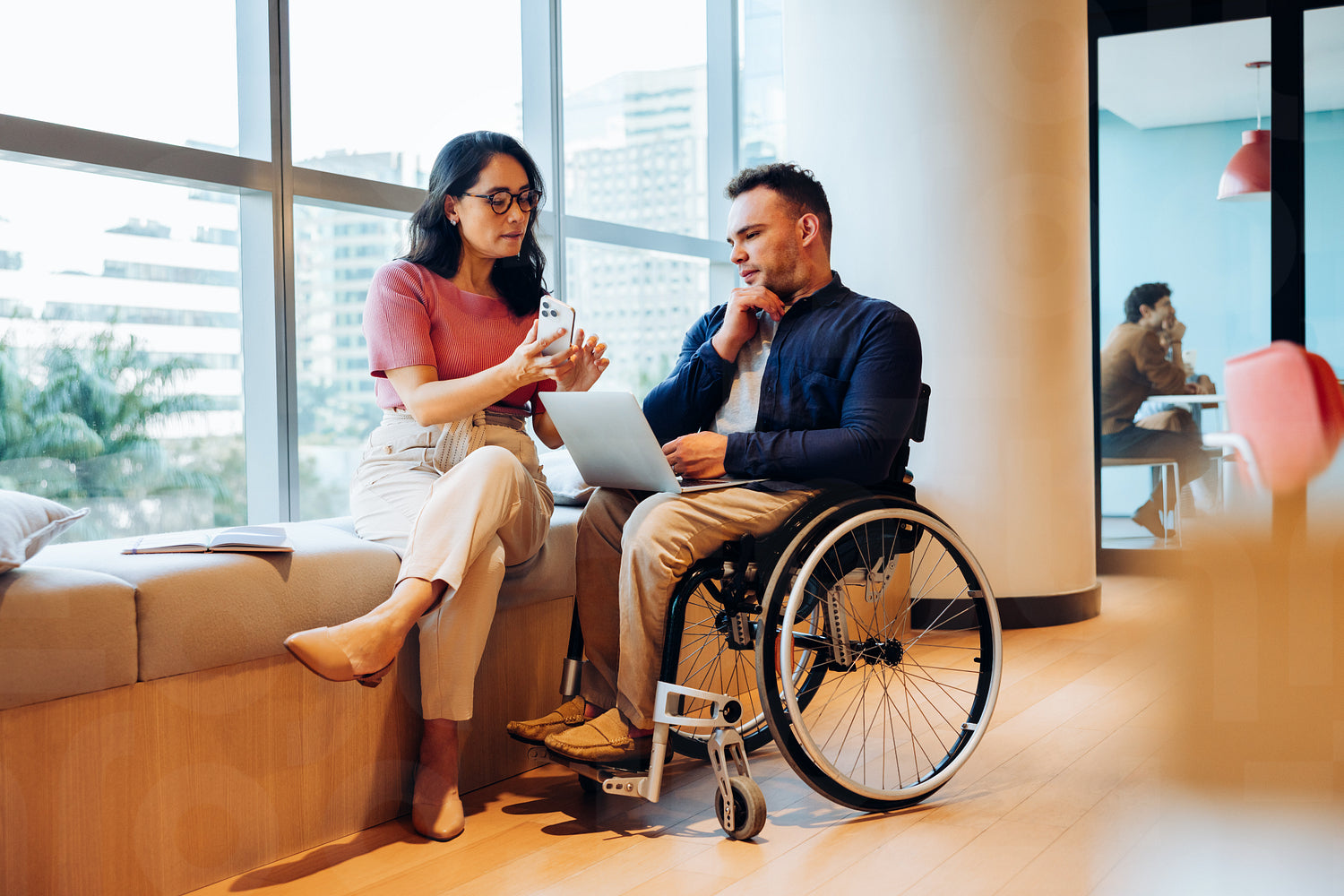 Two professionals discuss ideas in a modern office; one uses a laptop while the other holds a smartphone, fostering collaboration and inclusive teamwork.