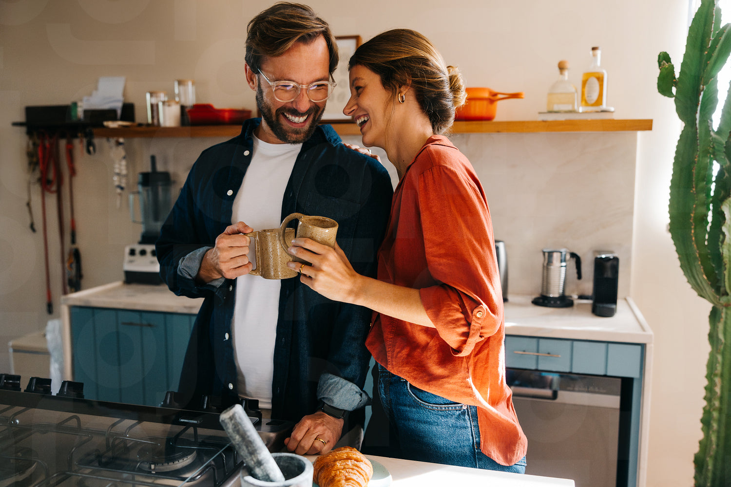 A couple smiles warmly in a bright kitchen as they share coffee mugs, enjoying a cozy morning moment together. They lean close, laughing, while modern appliances and a green cactus frame the scene.