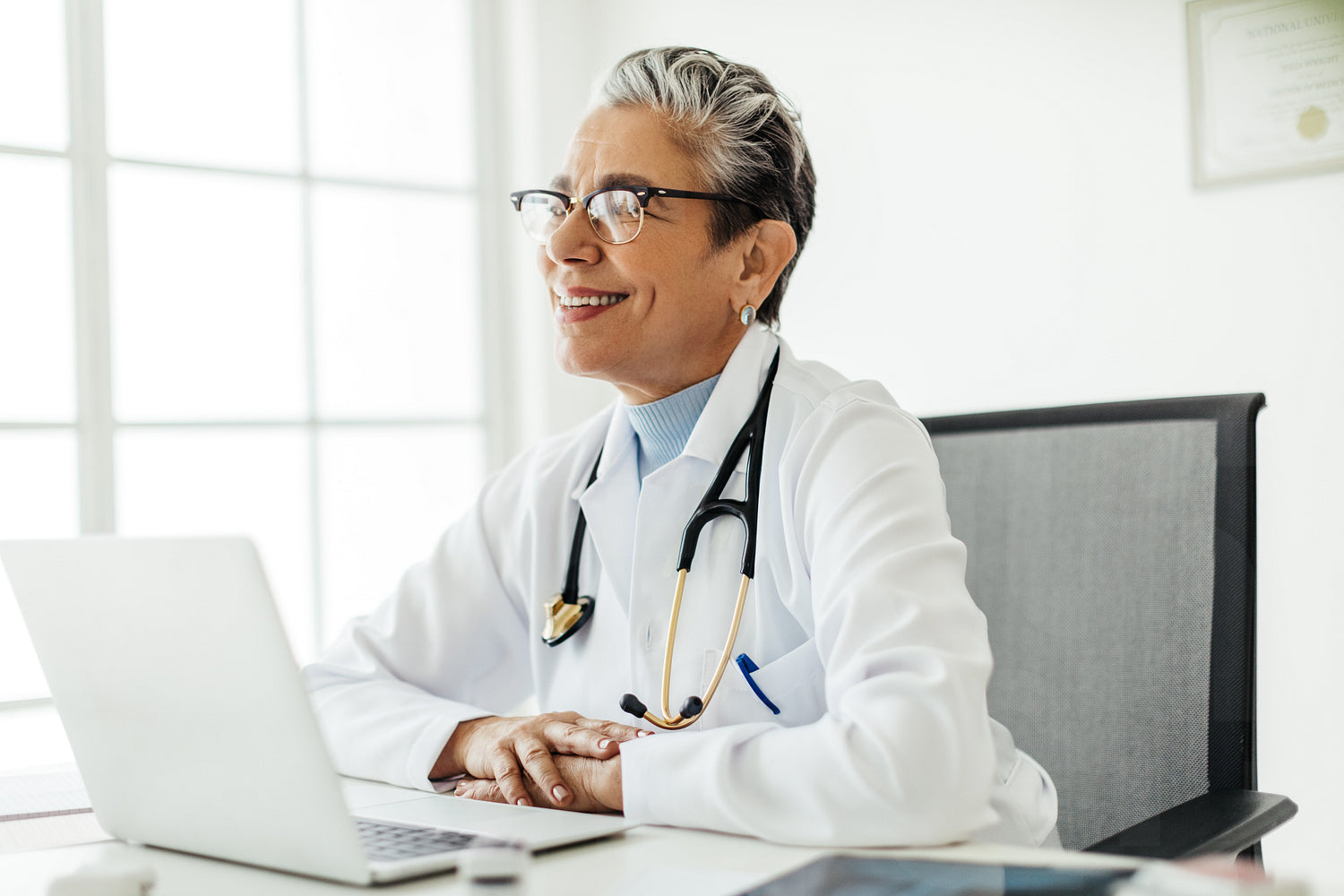 Experienced doctor sitting in front of a laptop in her office, smiling with a thoughtful expression. Mature female physician working in her office, wearing a lab coat and a stethoscope around her neck.