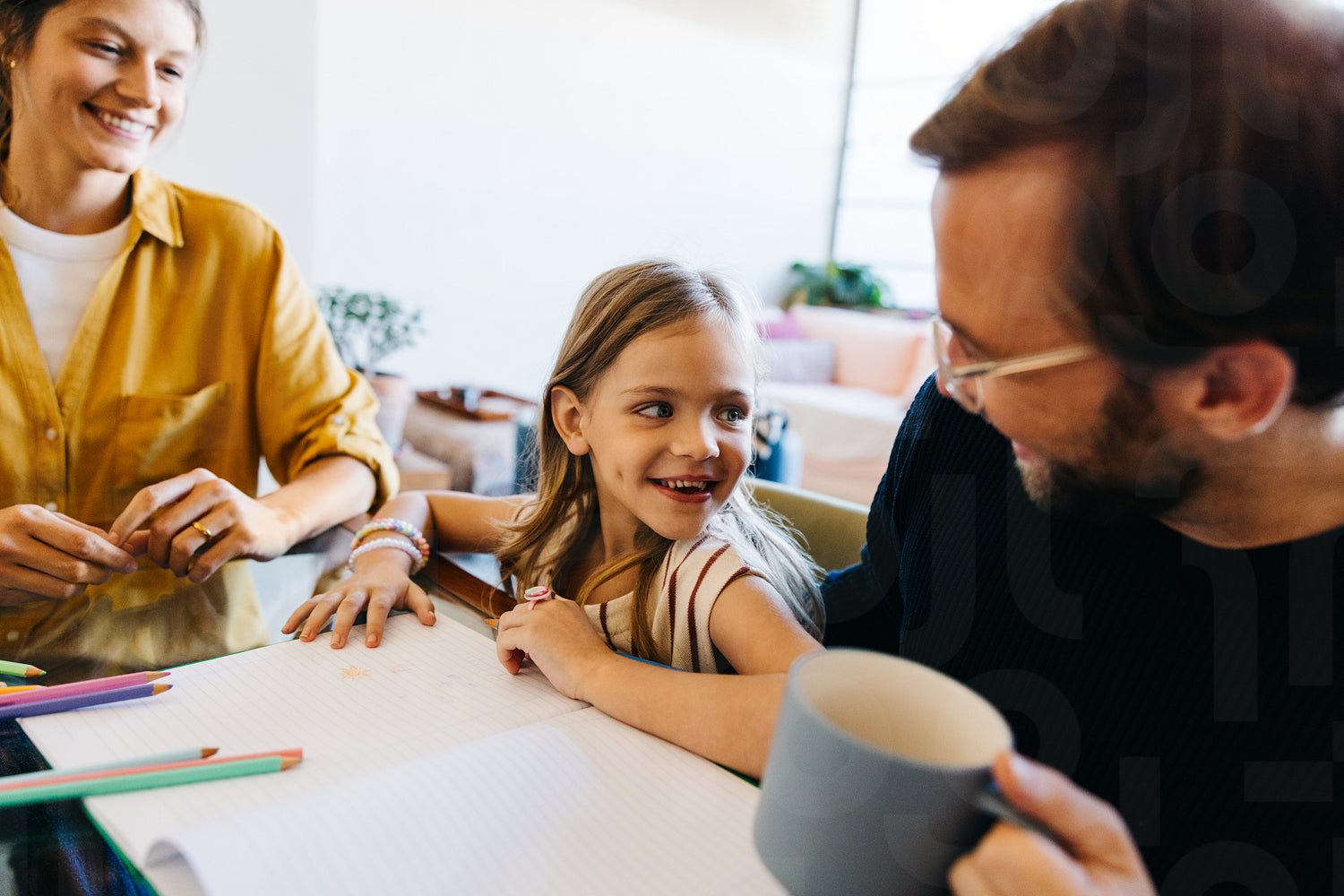 A family gathers around a notebook as a smiling girl draws. Her dad holds a mug while they chat, with mom nearby in a cozy, warm home setting.