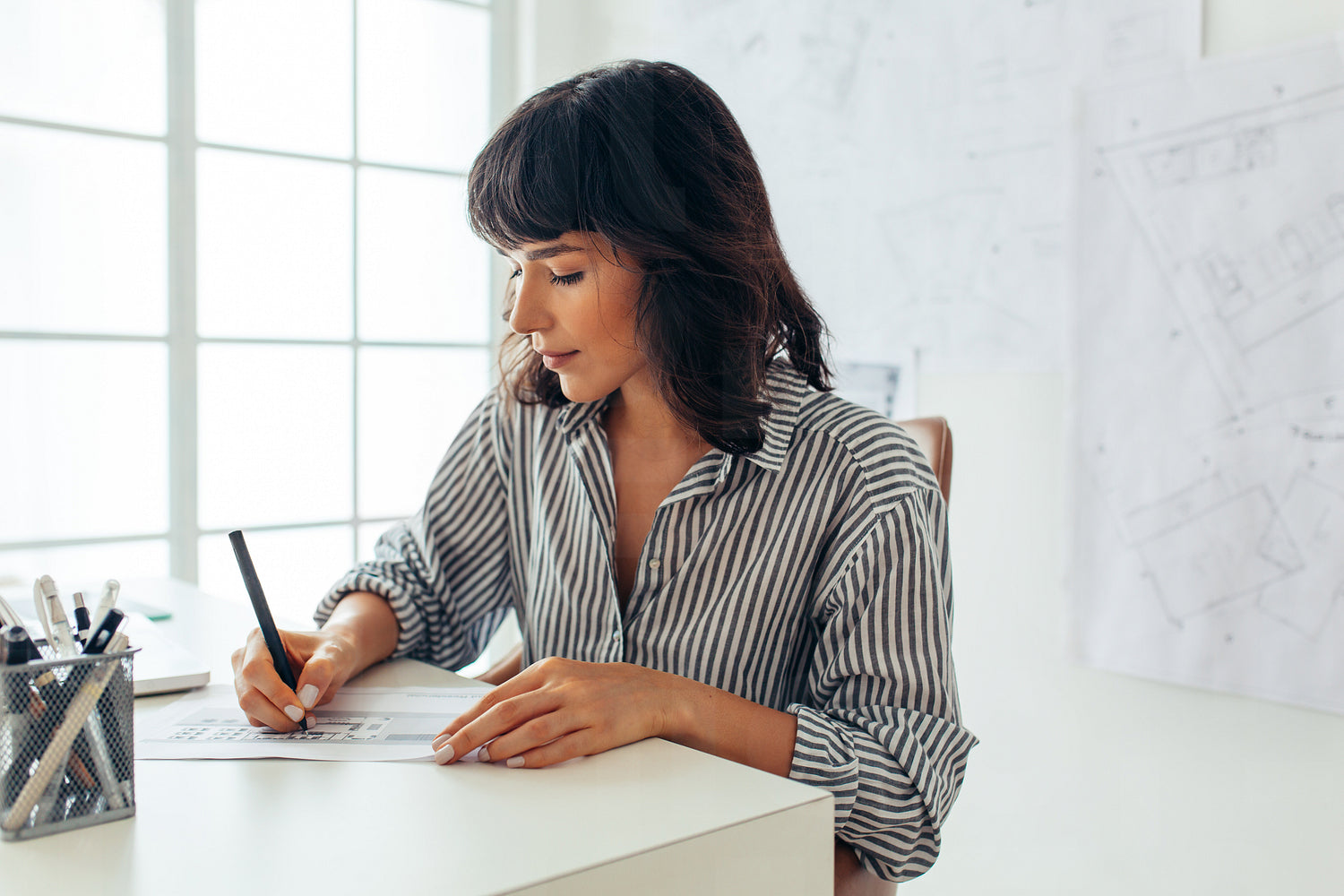 Close up of architect making architecture drawings. Woman working sitting at her desk in office.