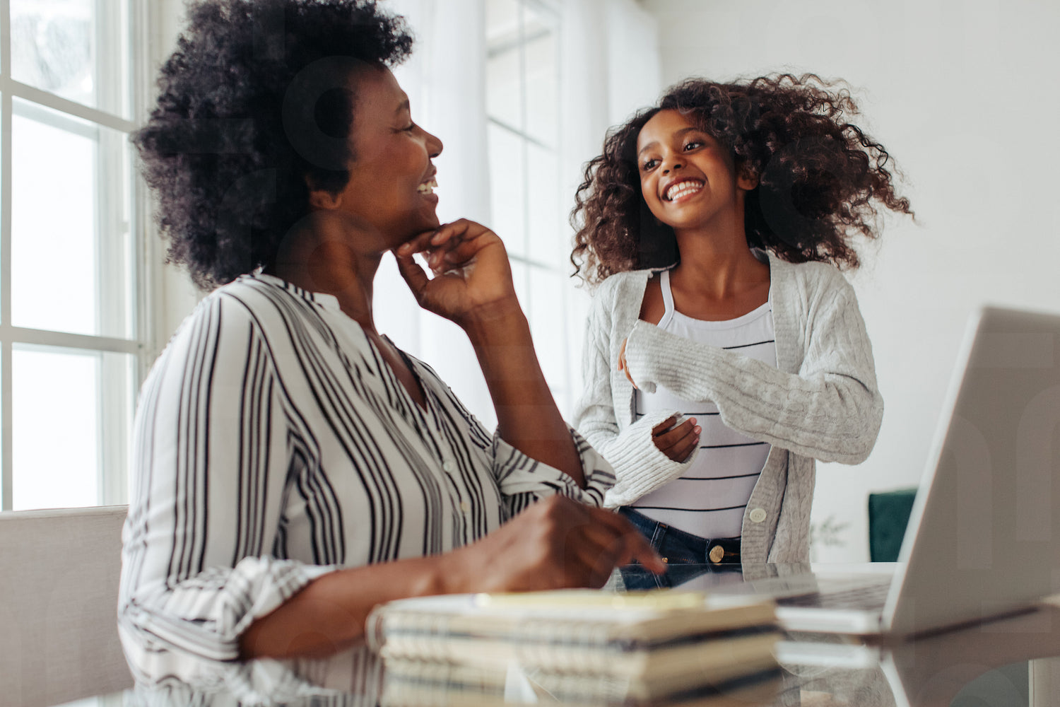 Girl playing with mother working from home. Mother daughter having fun break while working.
