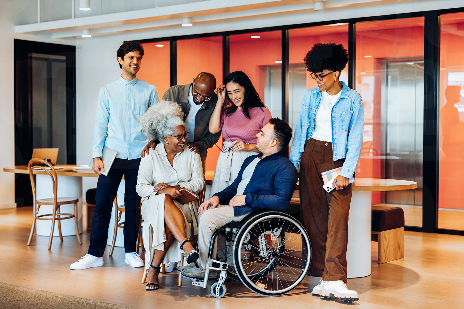 A diverse group of coworkers gathers around an elderly woman in a wheelchair and a man, sharing smiles and conversation in a bright, modern office space.