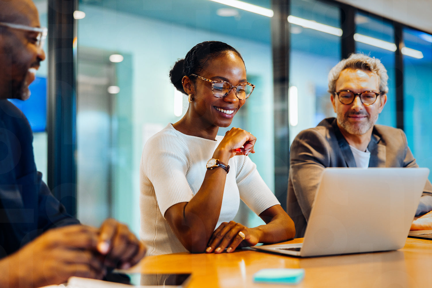 Three colleagues, two men and one woman, discussing work in a bright conference room, emphasizing teamwork and professional relationships.