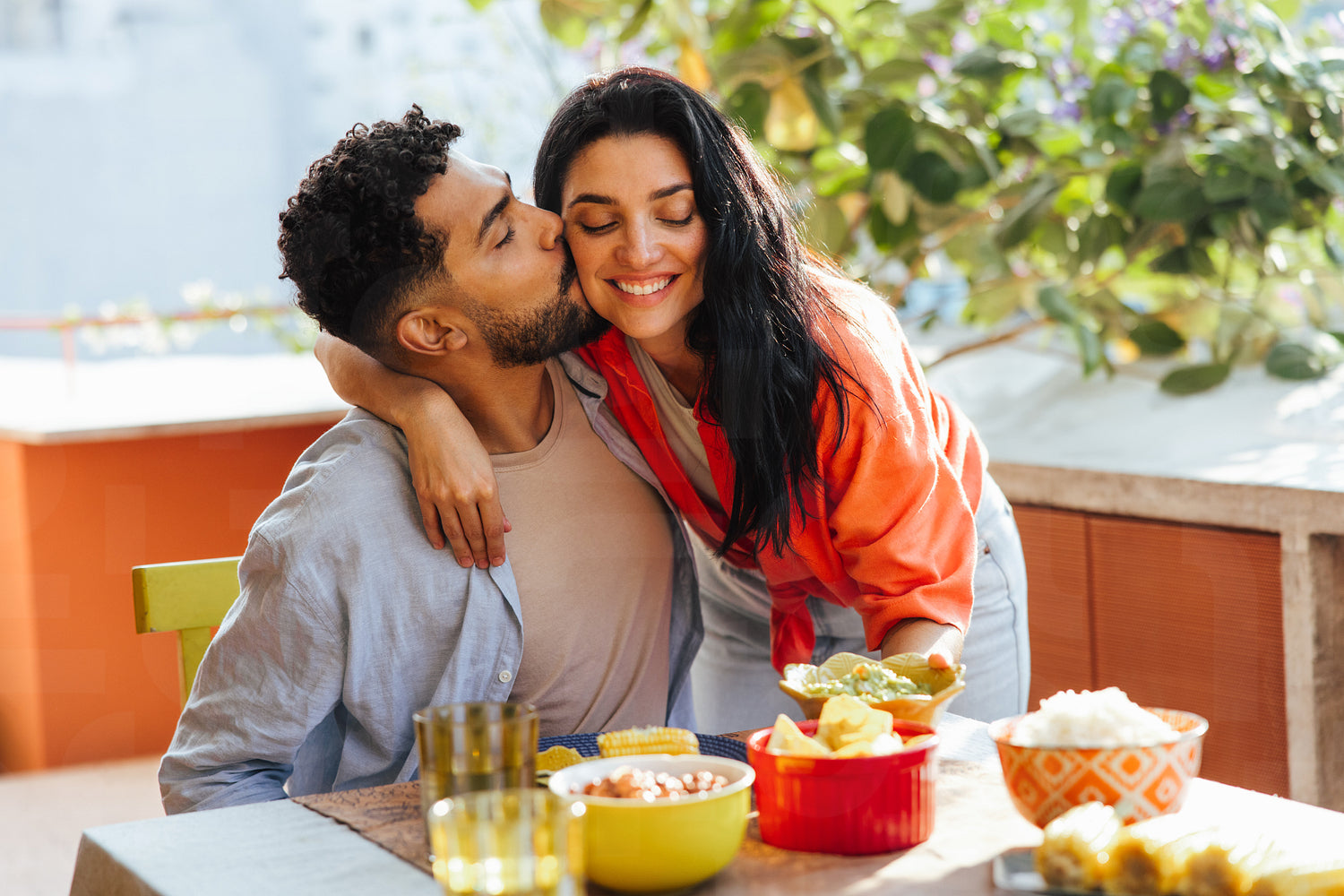 A loving couple sits together, sharing food and joy on a bright day outdoors. Featuring laughter, togetherness, and a friendly atmosphere, the image depicts a heartwarming dining experience.