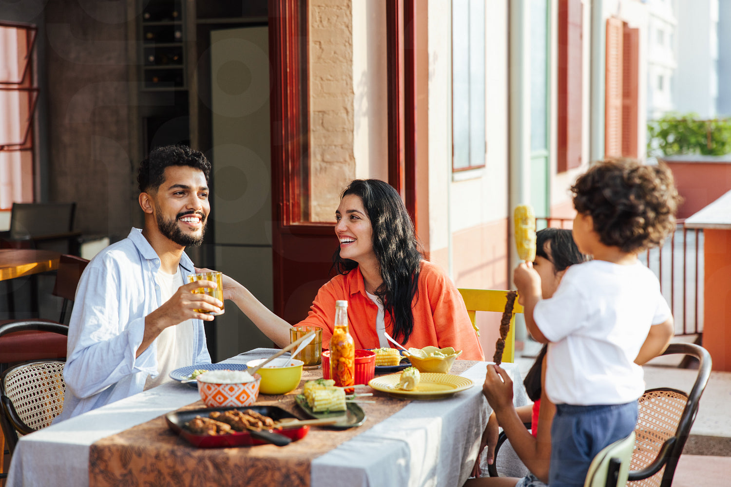 Latino family enjoying an outdoor meal and sharing joyful moments together