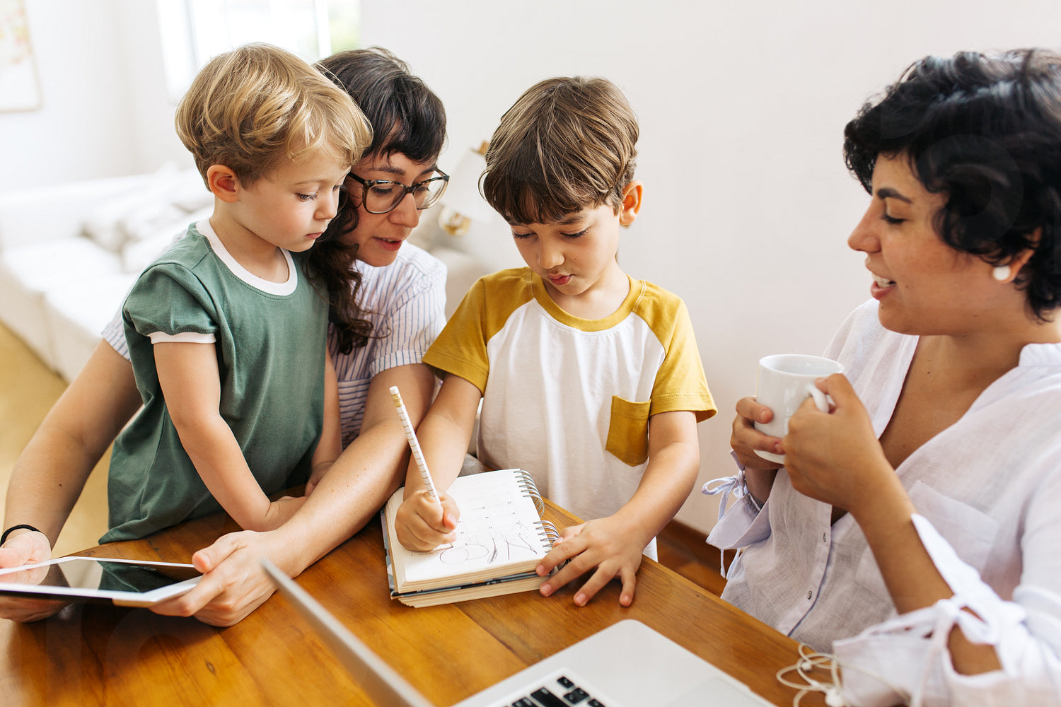 Lesbian couple with their kids at home. LGBT couple sitting at table with their to children.
