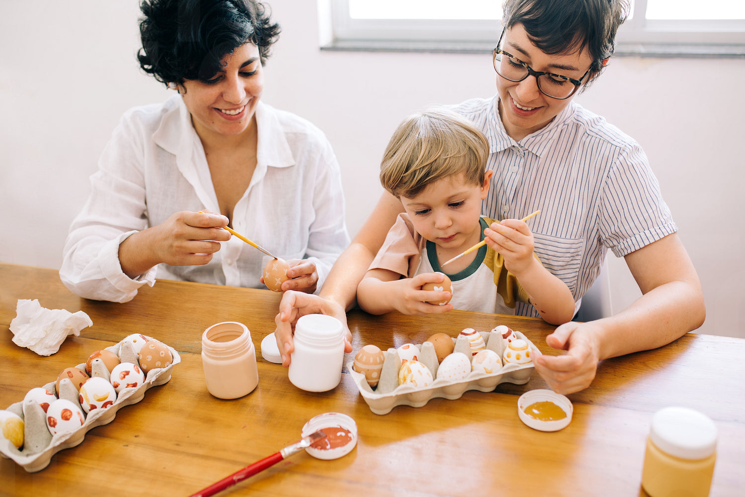 Young family preparing for easter by painting eggs in their living room. Lesbian couple with son together painting Easter eggs.