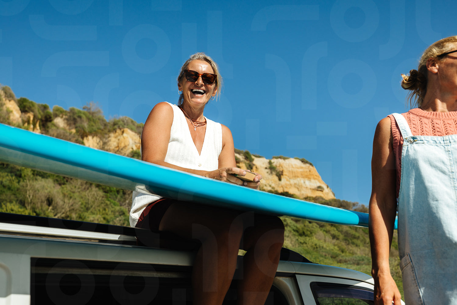 A mature woman enjoys a sunny day while waxing her surfboard near a coastal area. Warm smiles and bright natural surroundings emphasize a recreational and energetic outdoor vibe.