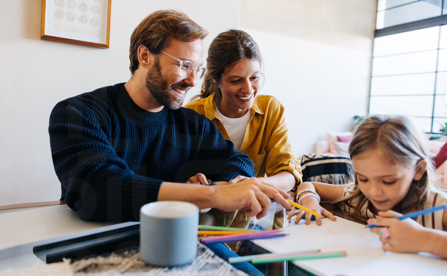 A man, woman, and young girl enjoy a colorful drawing session at a bright dining table, sharing pencils and paper in a cozy home setting.