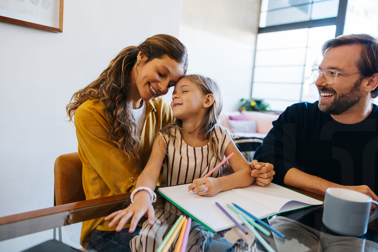A smiling mom and dad sit with their daughter at a glass table as she writes in a notebook, sharing a warm, supportive learning moment at home.