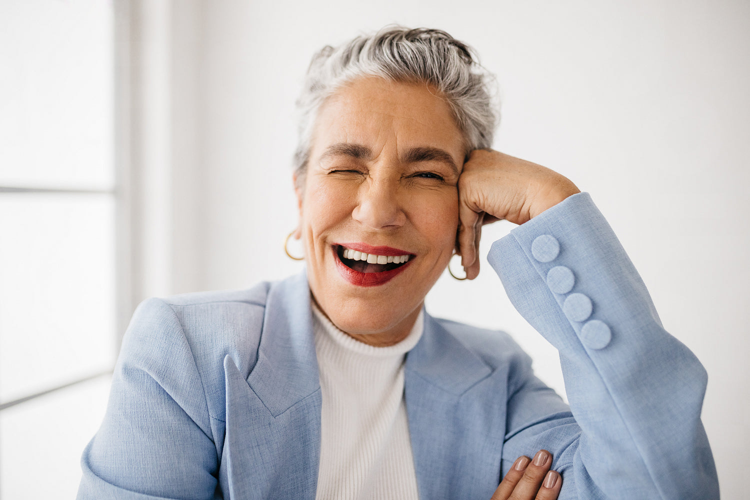 Senior female professional winking at the camera, sitting in her office in classy business attire. Mature business woman having fun at work, enjoying herself as an accomplished business person.