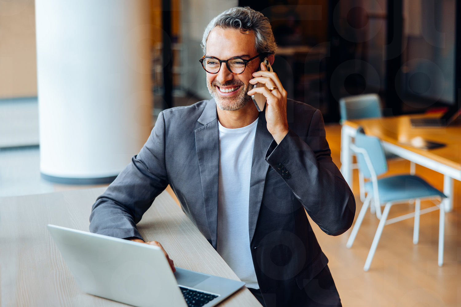 A smiling businessman, wearing glasses and a suit, talking on his phone while working at a laptop in a professional office environment, representing communication, productivity, and success.