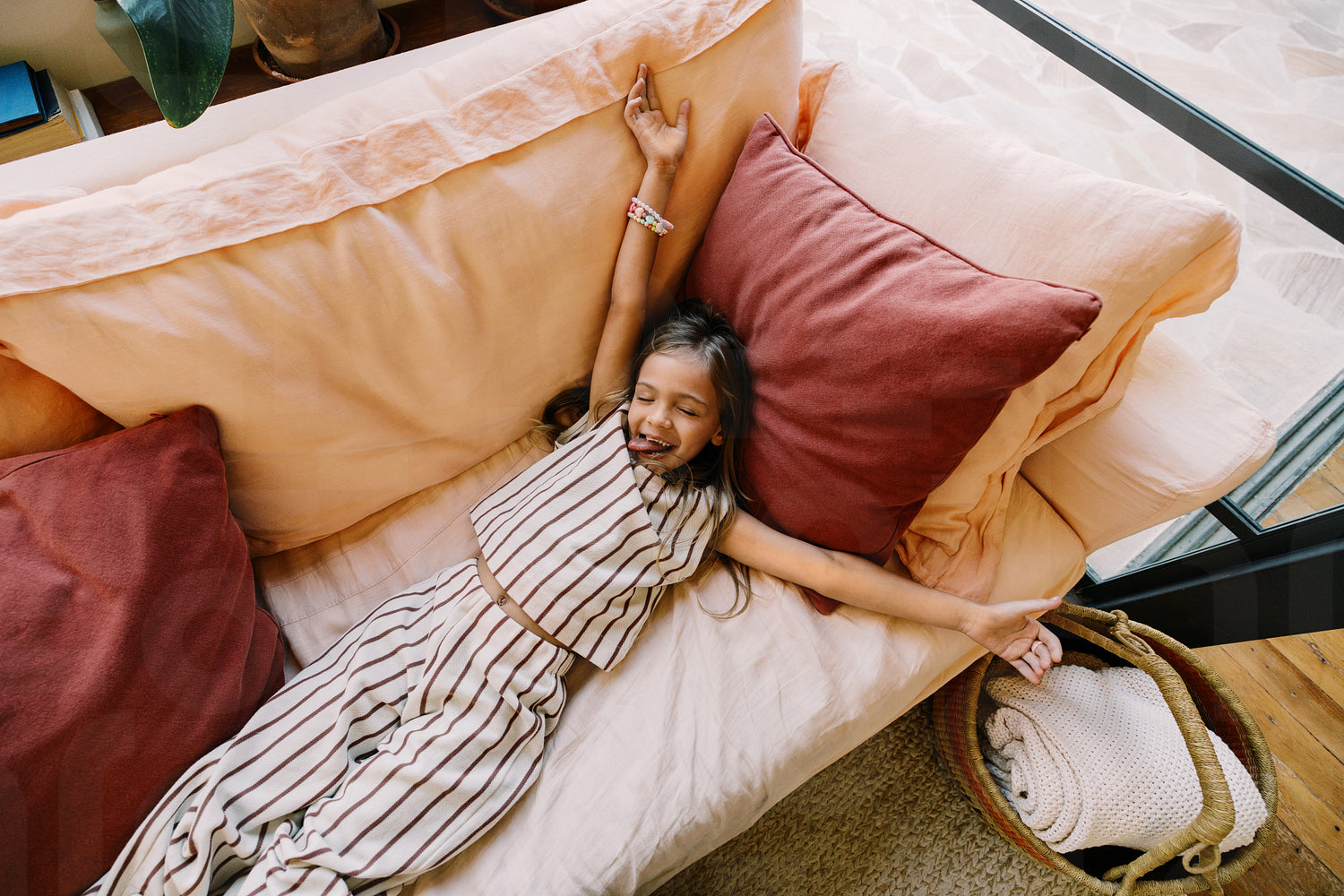 A girl lounges on a peach sofa with pink cushions, smiling and stretching in a cozy living room. A warm, relaxed family moment that conveys comfort and everyday joy.