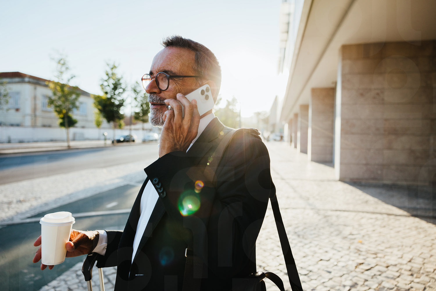 A mature businessman in formal attire holding a coffee cup and talking on the phone outdoors.