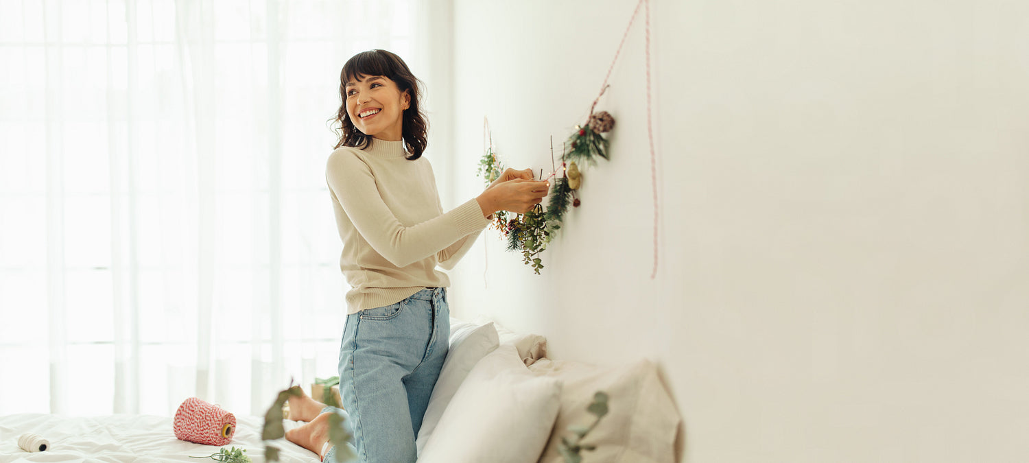 Woman making christmas decorations at home. Happy woman decorating home for christmas.
