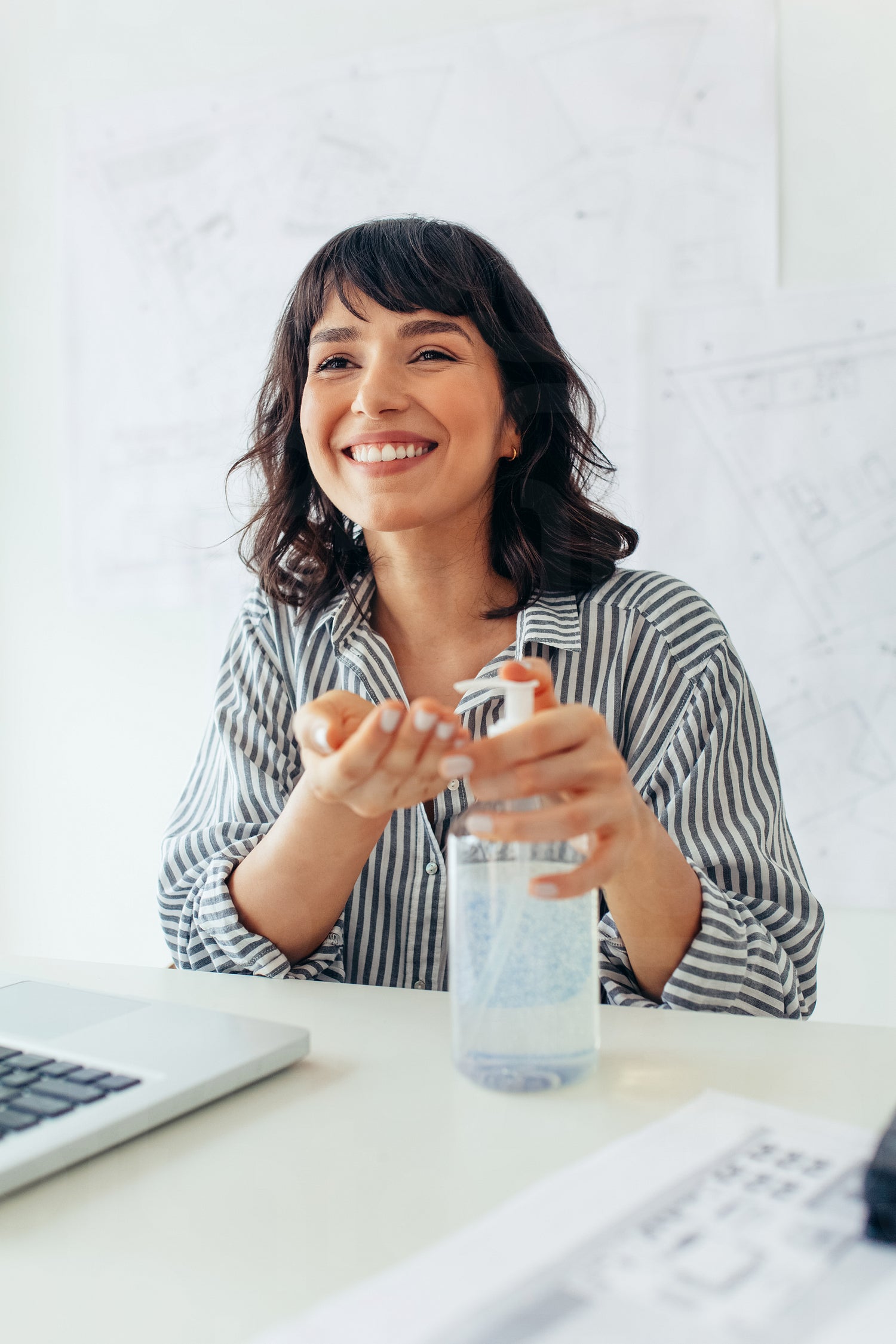 Businesswoman using a sanitizer to disinfect hands sitting at workplace. Cheerful woman following hand hygiene at workplace.