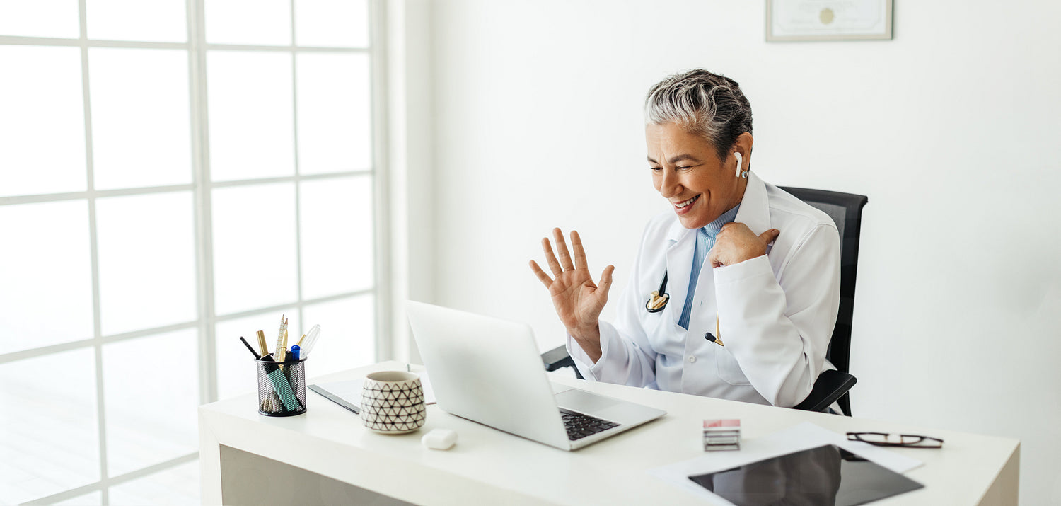 Senior female doctor waving at a patient on a video call. Mature physician having an online consultation with her quarantined patients, using technology to provide healthcare from her office.