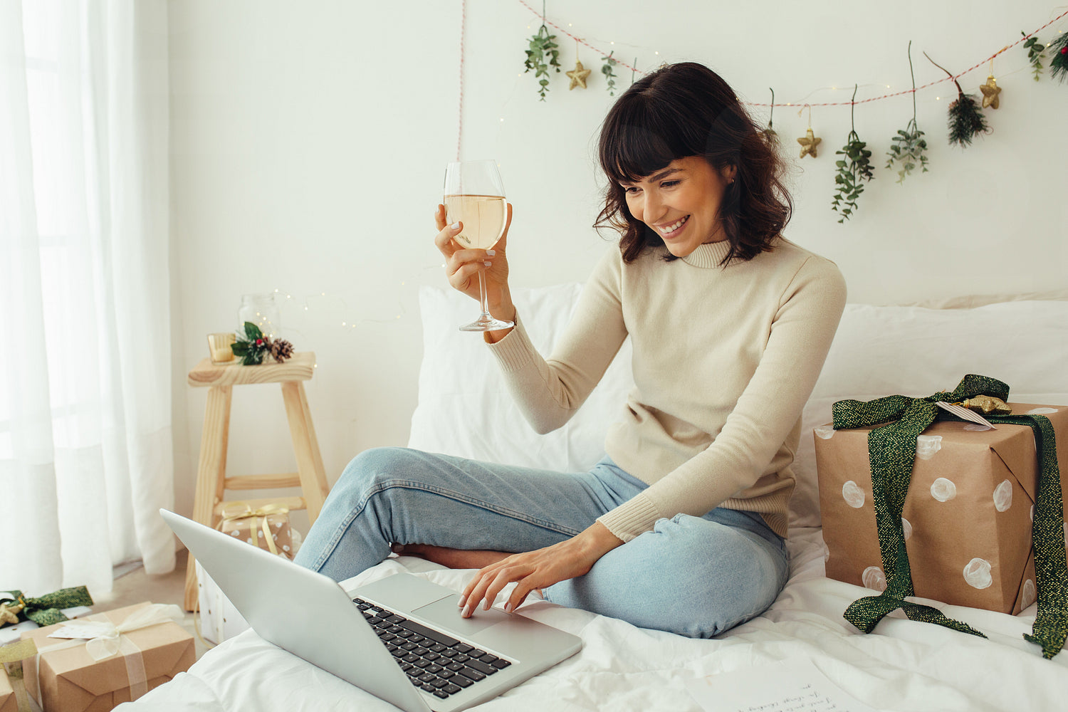 Happy woman celebrating christmas with family and friends on video call using a laptop computer. Woman raising a wine glass on video call.