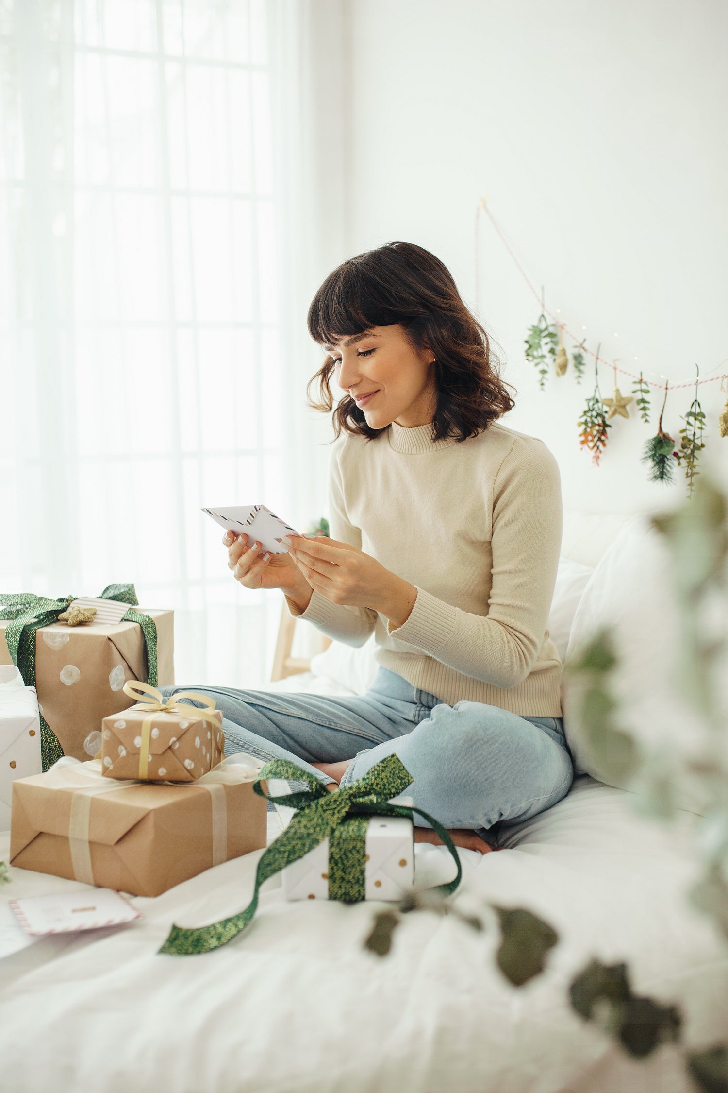 Smiling woman reading her christmas mail. Woman sitting on bed with christmas presents in decorated room.