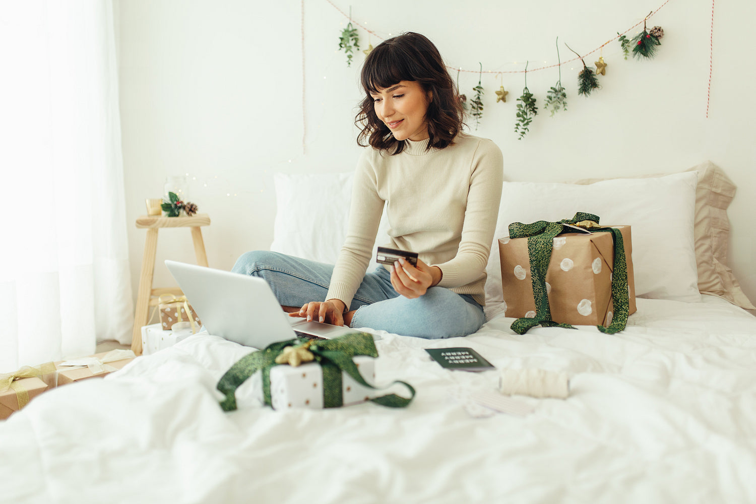 Woman paying with credit card for online christmas shopping. Woman sitting on bed using laptop computer at home decorated for christmas.