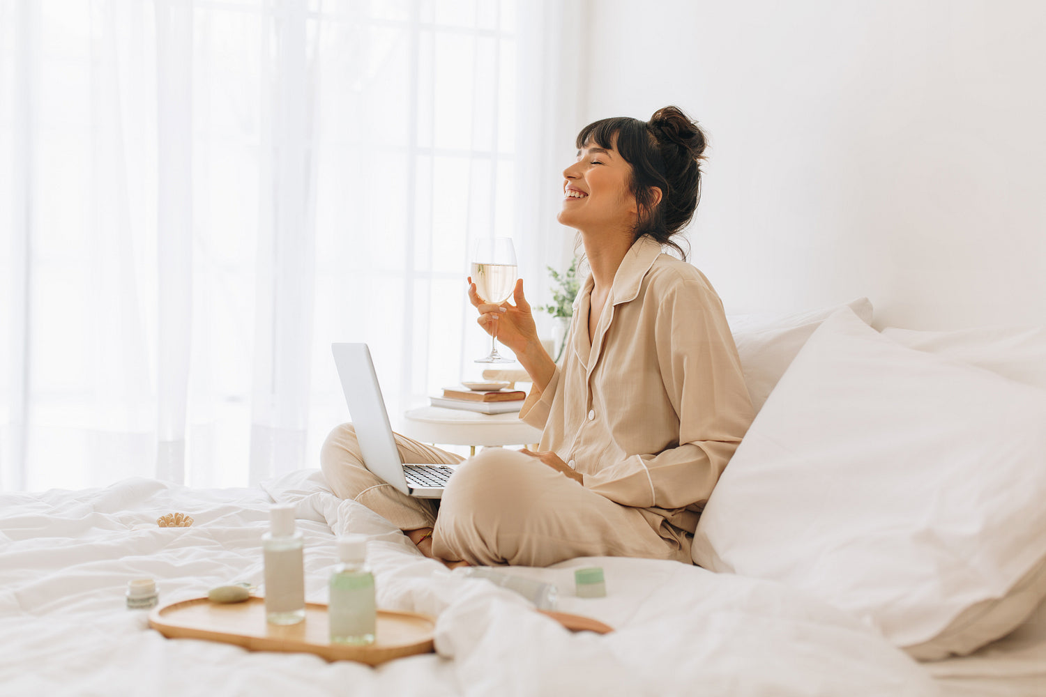 Side view of smiling woman sitting on bed using laptop and enjoying wine after beauty care. Woman on video call using laptop computer at home.