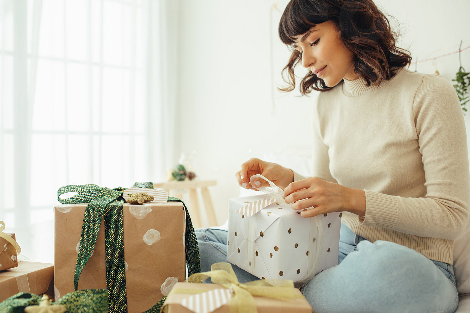 Close up of woman sitting on bed packing christmas presents. Woman sitting on bed making preparations for christmas.