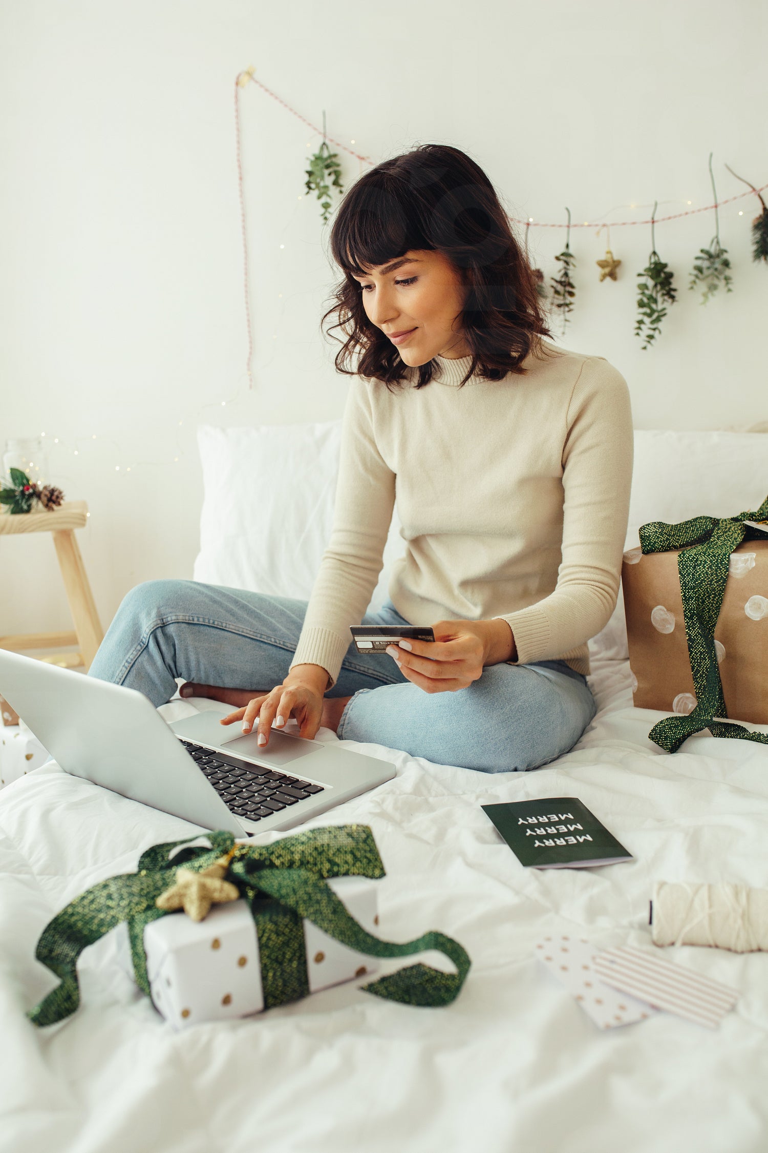 Woman sitting on bed using laptop computer for making credit card payment. Woman doing online shopping for christmas sitting at home.