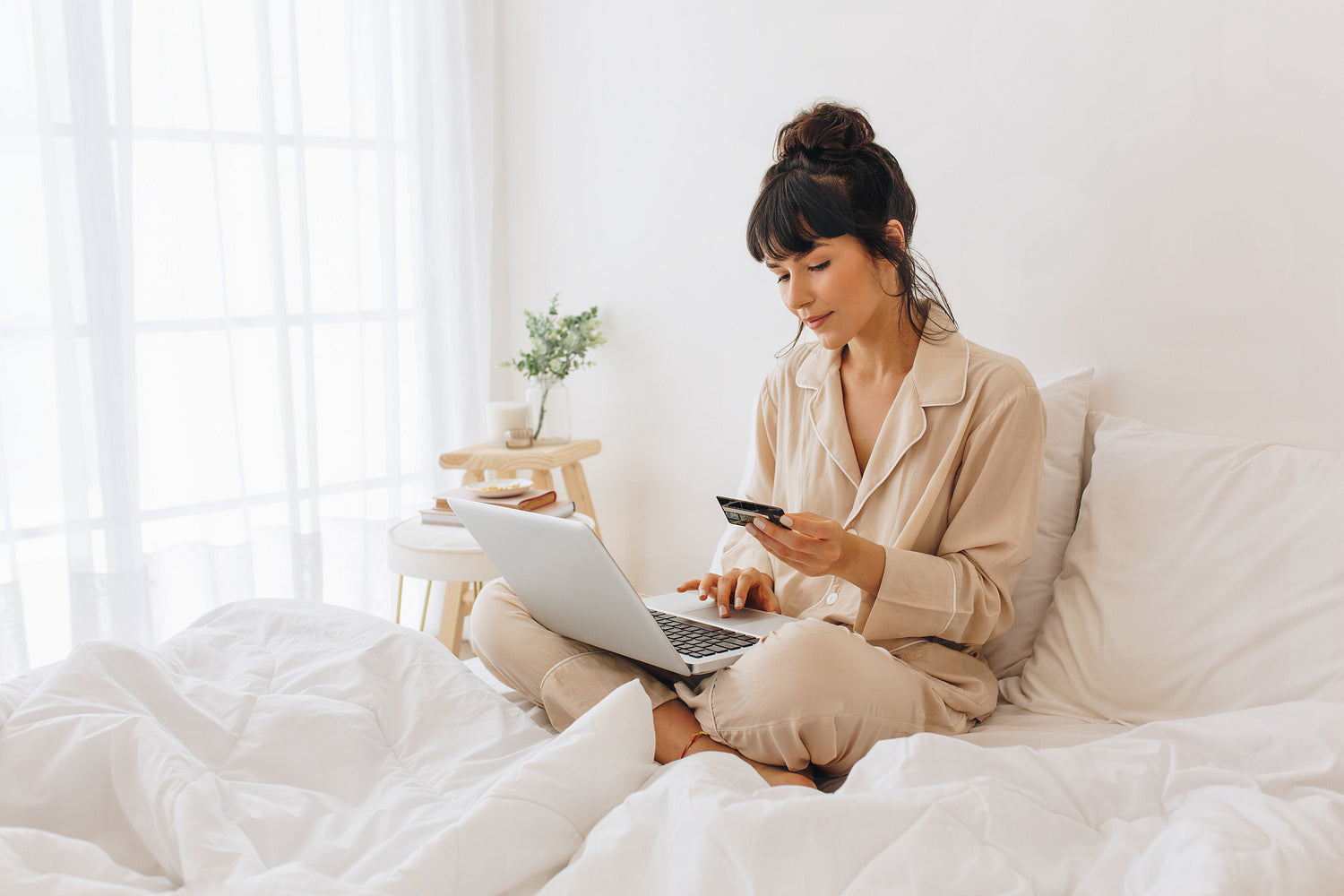 Woman in night suit sitting on bed using credit card to make online transaction. Woman doing online shopping sitting on bed at home.